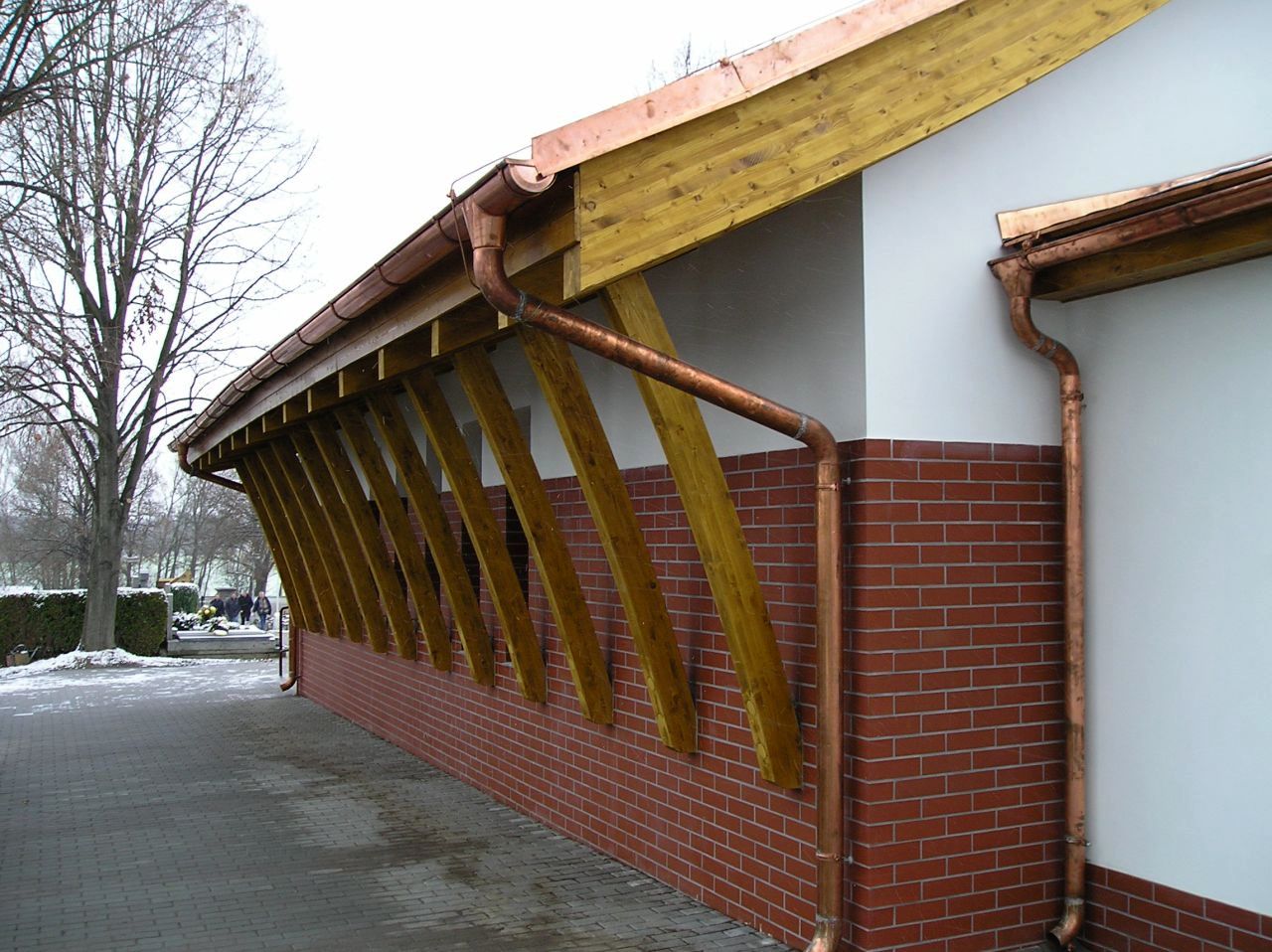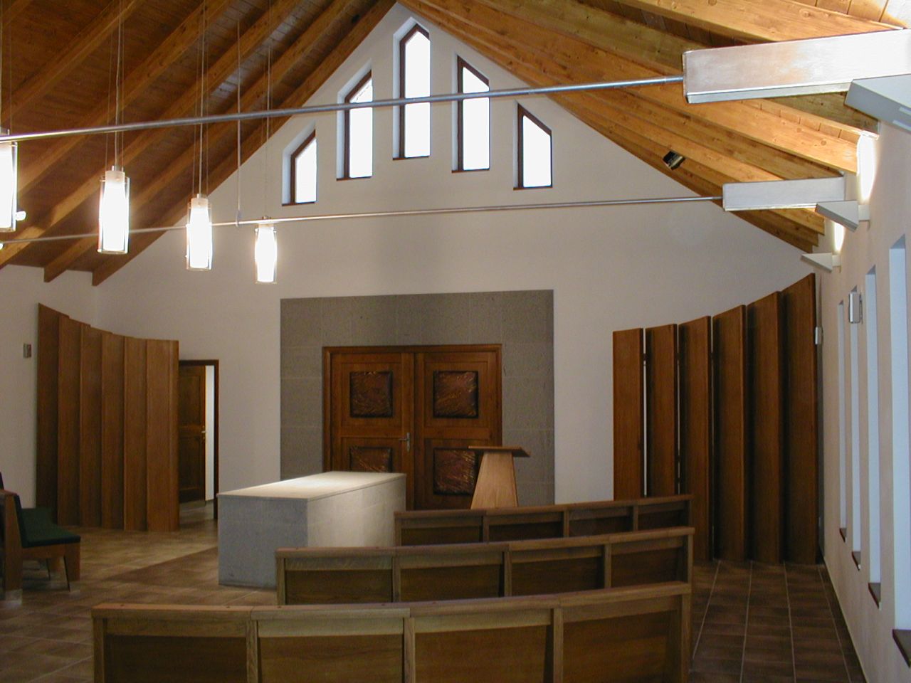 Konstrukce střechy je tvořena dřevěnými lepenými nosníky, přiznanými v interiéru a doplněnými dřevěnými palubkami. Obvodové zdivo je doplněno cihlovým obkladem Klinker. Brána, hlavní vstupy a katafalk jsou obloženy šedou žulou.