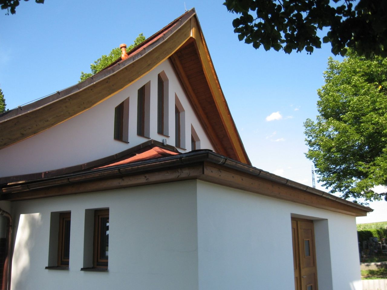 Architektuře budovy dominuje prohnutá střecha s výrazným přesahem přes obvodové stěny, jejíž hřeben stoupá od vstupu do svého vrcholu nad obřadním místem. Nástup do síně je zdůrazněn předsazenou bránou, symbolizující Počátek, jako nezbytný kontrapunkt ke Konci, nacházejícím se uvnitř na obřadním místě.